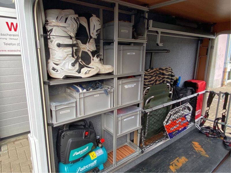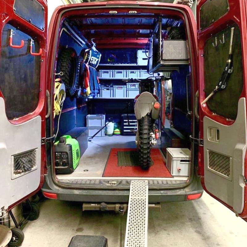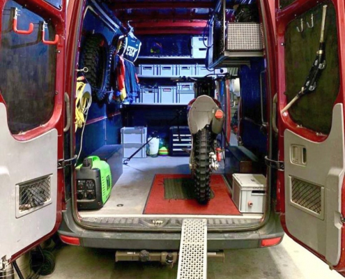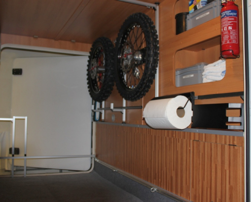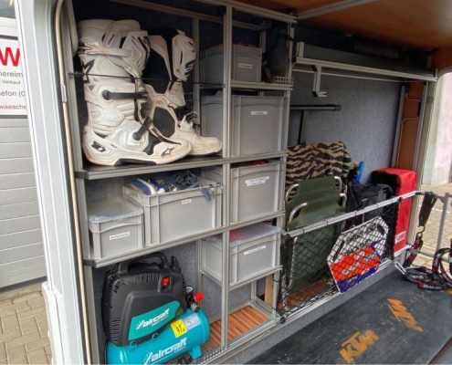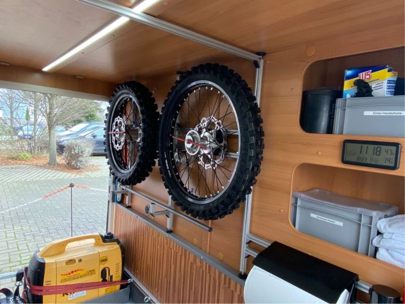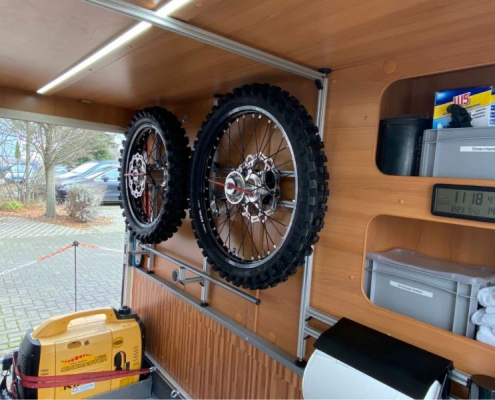 Durch die flexible Bauweise mit Aluprofilen sind keine Grenzen gesetzt, Motorrad, Fahrrad, Kite oder Surfbrett usw. können im Van, in der Heckgarage oder im Anhänger transportiert werden. Entsprechend Eurer Ansprüche bauen wir Van, Heckgarage oder den Anhänger so aus, dass Ihr alles mitbekommt und platzsparend unterbringt. Gerne könnt Ihr Eure Ideen und Wünsche mit einbringen und wir setzen diese um.